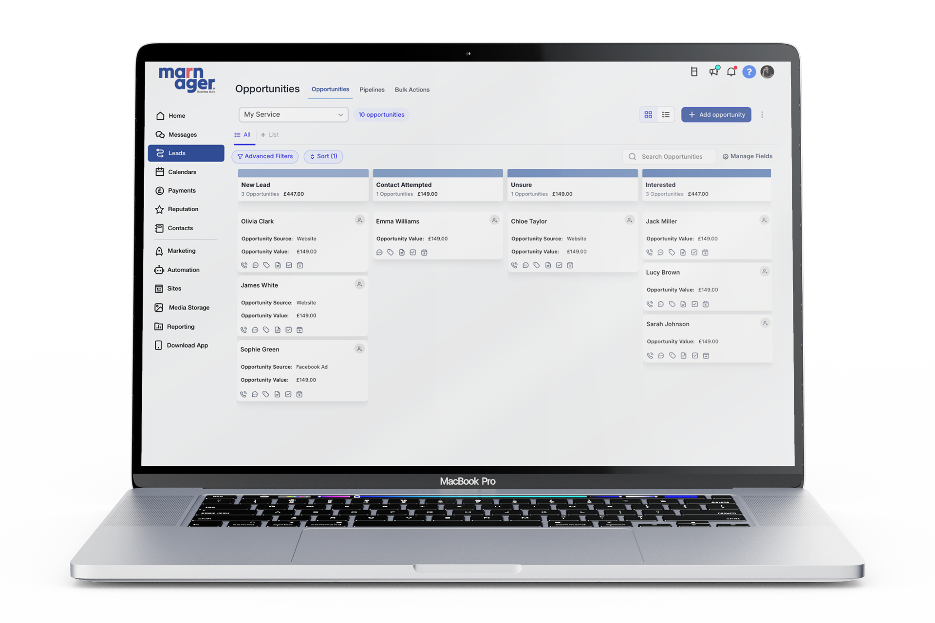 Leads are important, but converting them is key. With Marnager, your leads automatically drop in from your campaigns, including Facebook, Google, Instagram, and LinkedIn. Track customer interactions and nurture leads from start to finish, ensuring all potential customers feel valued. Never miss another opportunity to grow your business.